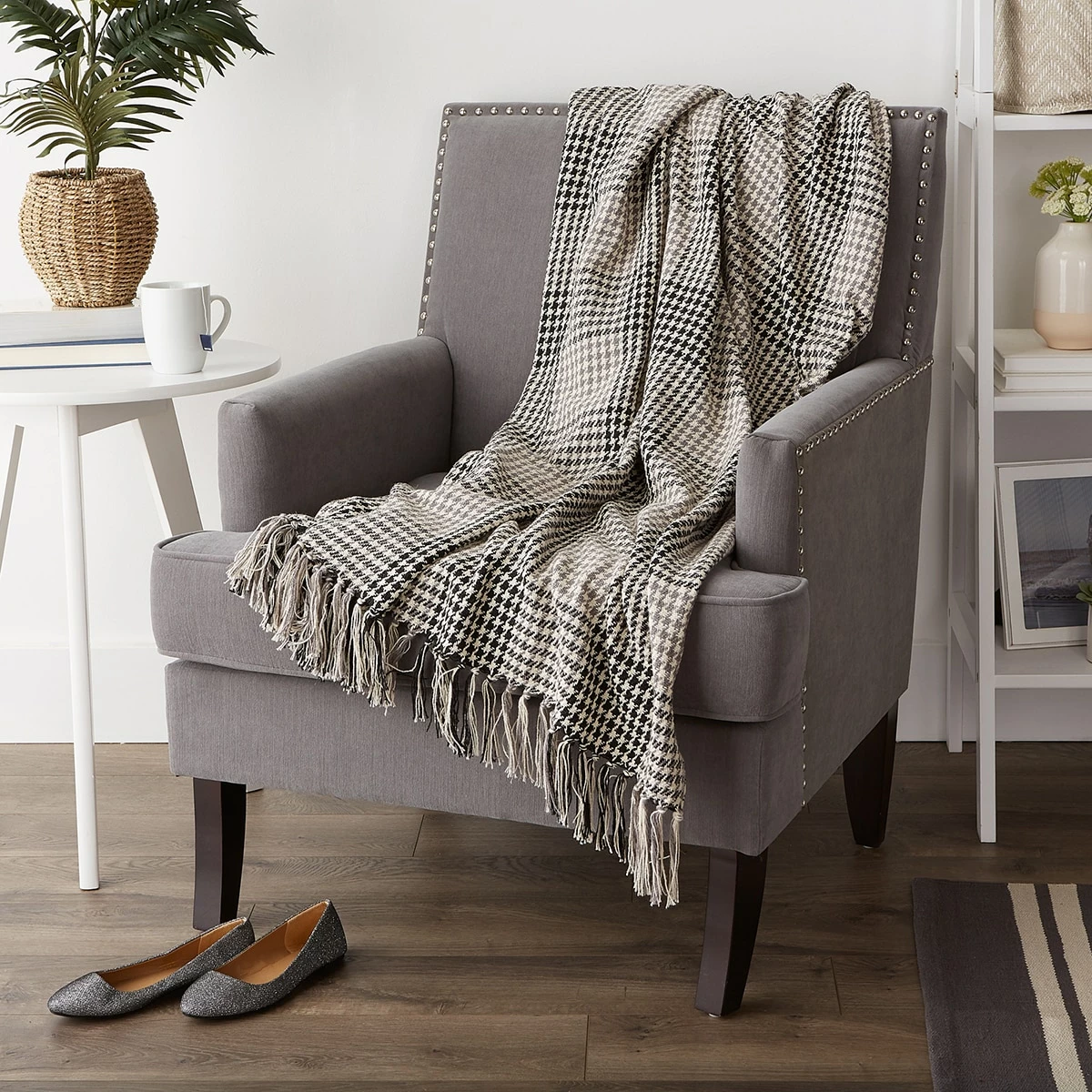 The DII® Houndstooth plaid throw measures 50″ x 60″ and is constructed from 100% cotton. This throw will compliment any decor and features a 3″ decorative fringe for the perfect finish that won’t unravel in the wash. A classic pattern that will compliment any decor. Perfect to throw over a couch or chair to add a splash of color and provide warmth on a cold night. Use DII® throw blankets to stay warm, as a decor piece over a chair or couch, to wrap housewarming gifts, as a picnic blanket or when camping.This item requires oversize delivery. Please refer to the Order Summary in the Shipping step at checkout for delivery charge.