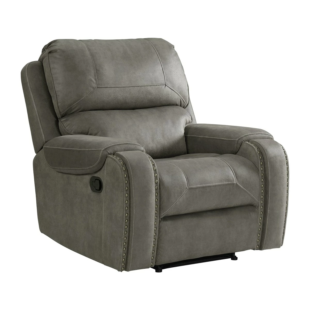 Elements Clay glider recliner. Prop up your legs on the plush leg rest and lean back for ultimate comfort. Features contrast stitch, padded saddle arms, and nail head trim.