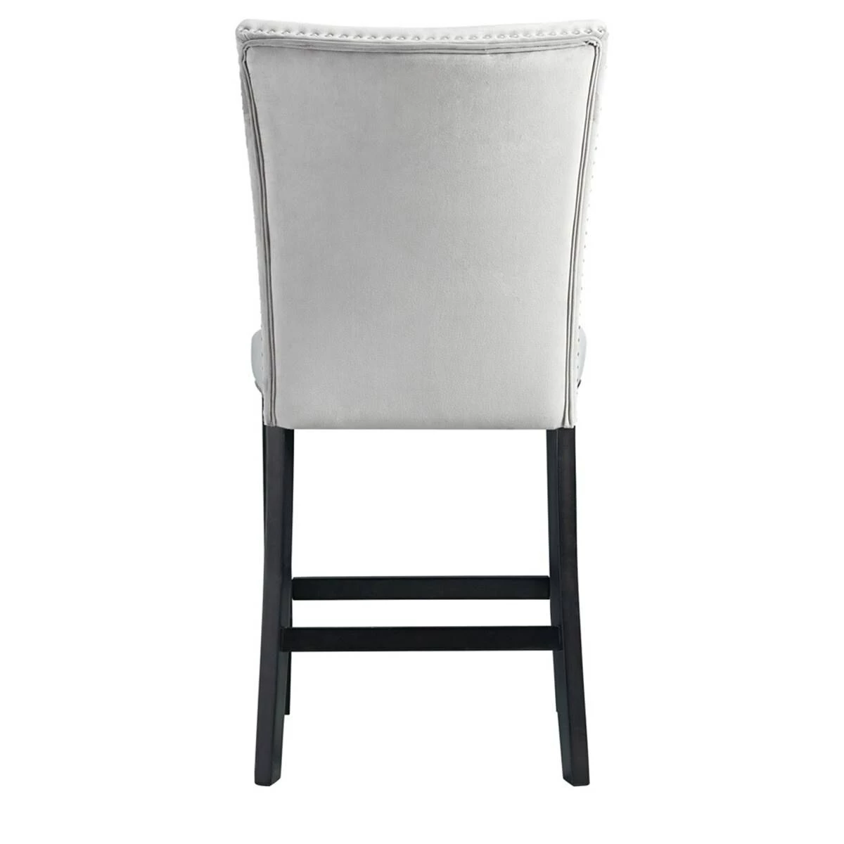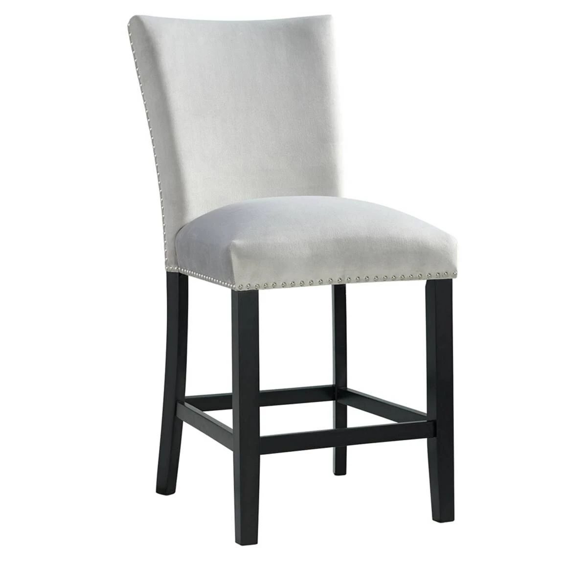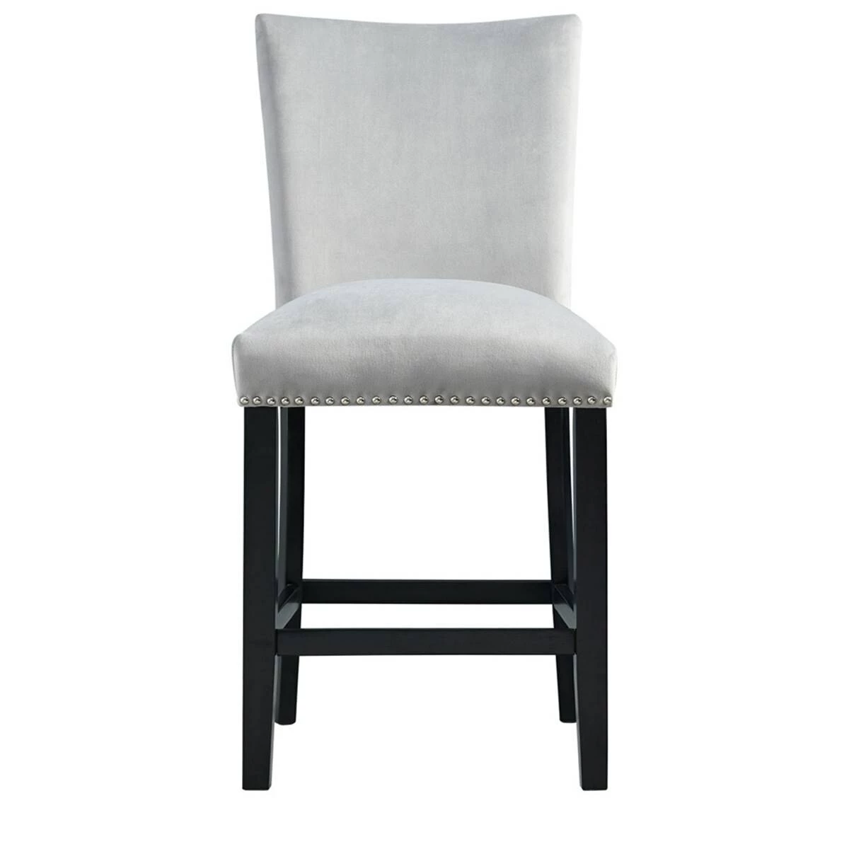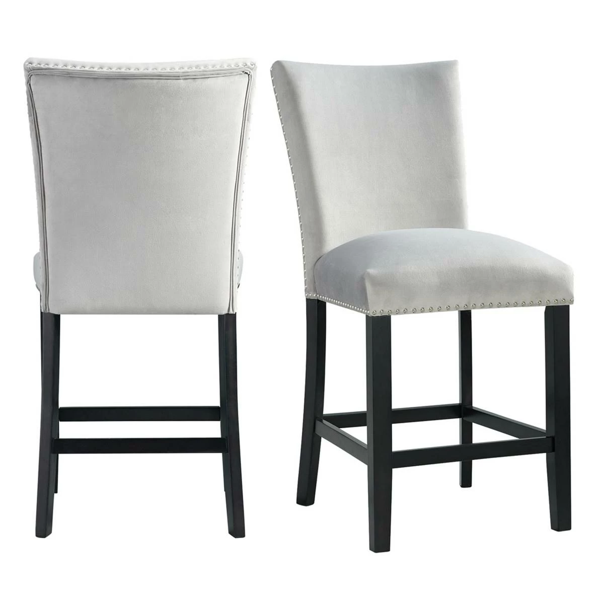 This Elements Francesca grey velvet counter height chair set instantly updates your dining room! This chair set is upholstered in a show stopping grey velvet, which will elevate your dining room to the next level. The chrome nailhead trim outlines the edges of these chairs, adding an extra flair to this already stunning set. The grey velvet pairs beautifully with the sleek black finish on the legs. Add these chairs to your home today for a look that will never go out of style!This item requires oversize delivery. Please refer to the Order Summary in the Shipping step at checkout for delivery charge.
