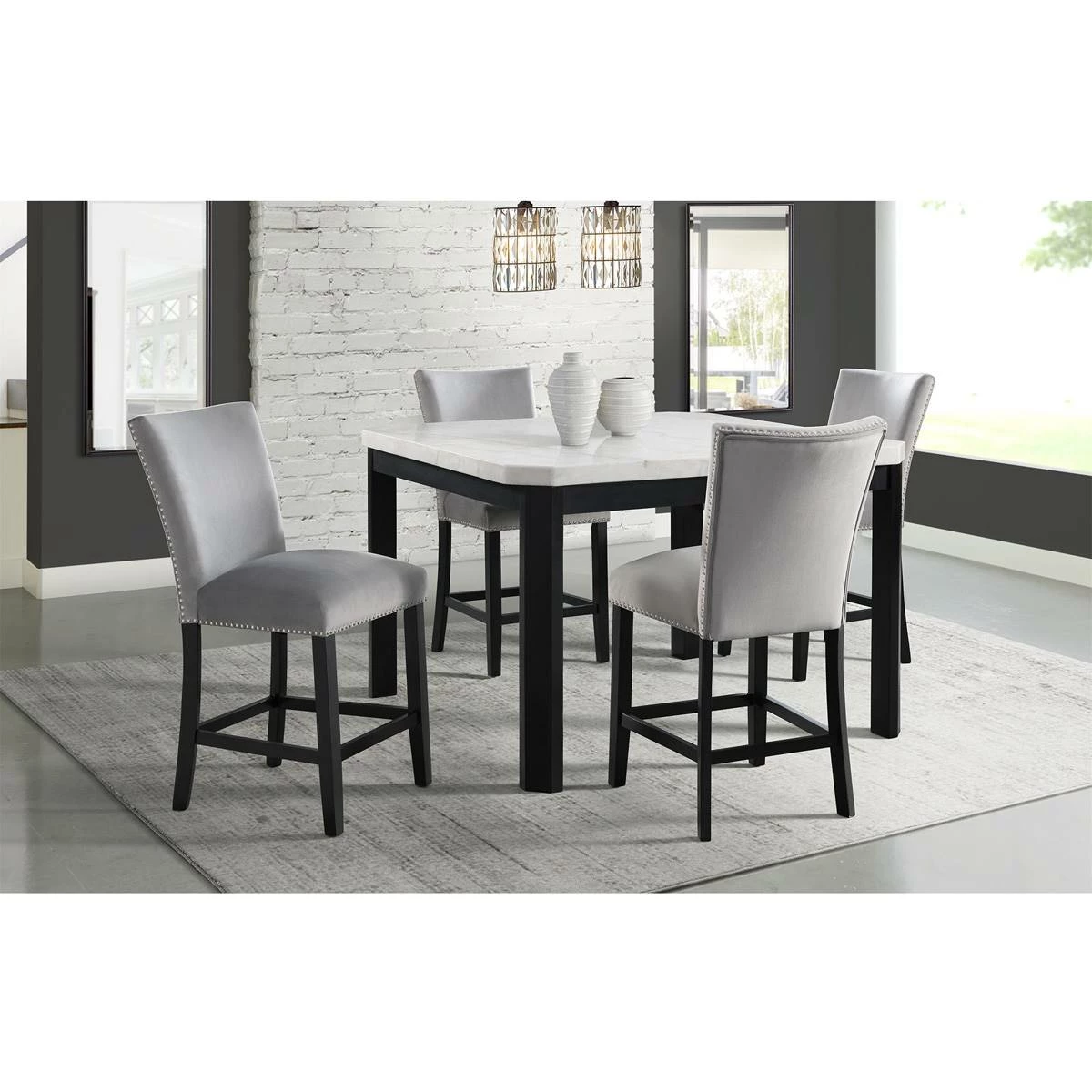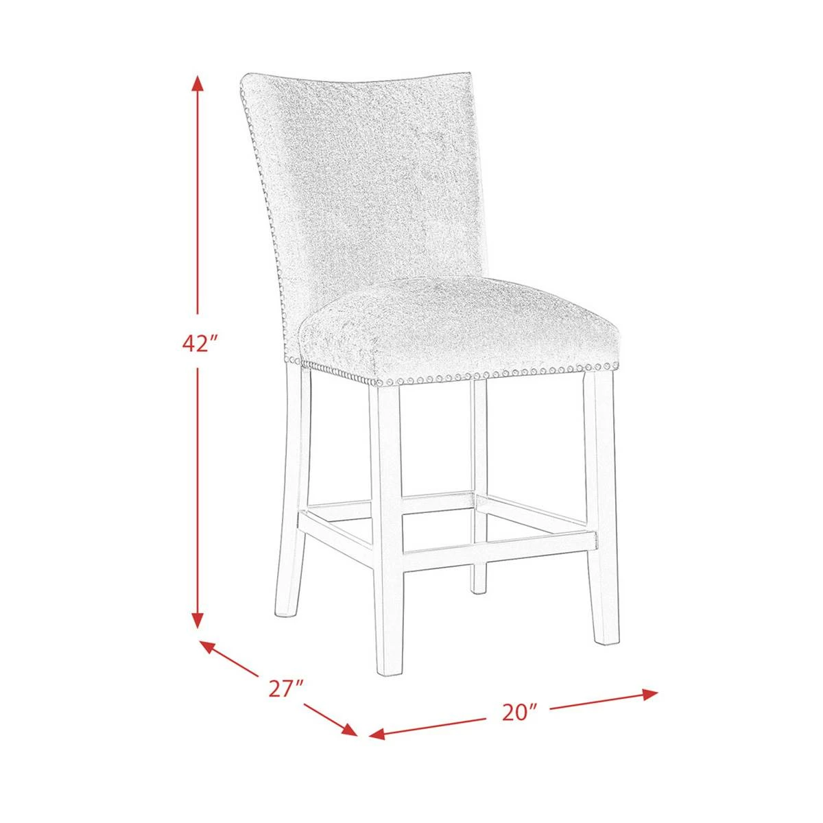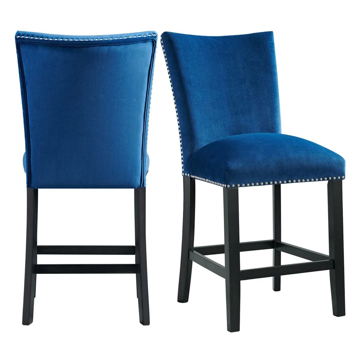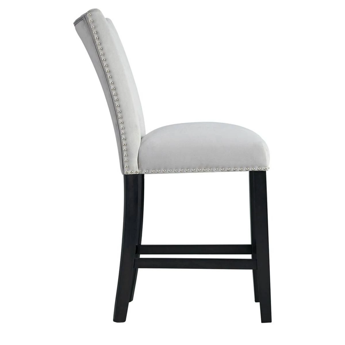This Elements Francesca grey velvet counter height chair set instantly updates your dining room! This chair set is upholstered in a show stopping grey velvet, which will elevate your dining room to the next level. The chrome nailhead trim outlines the edges of these chairs, adding an extra flair to this already stunning set. The grey velvet pairs beautifully with the sleek black finish on the legs. Add these chairs to your home today for a look that will never go out of style!This item requires oversize delivery. Please refer to the Order Summary in the Shipping step at checkout for delivery charge.