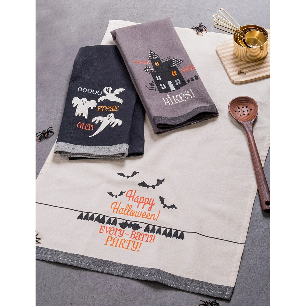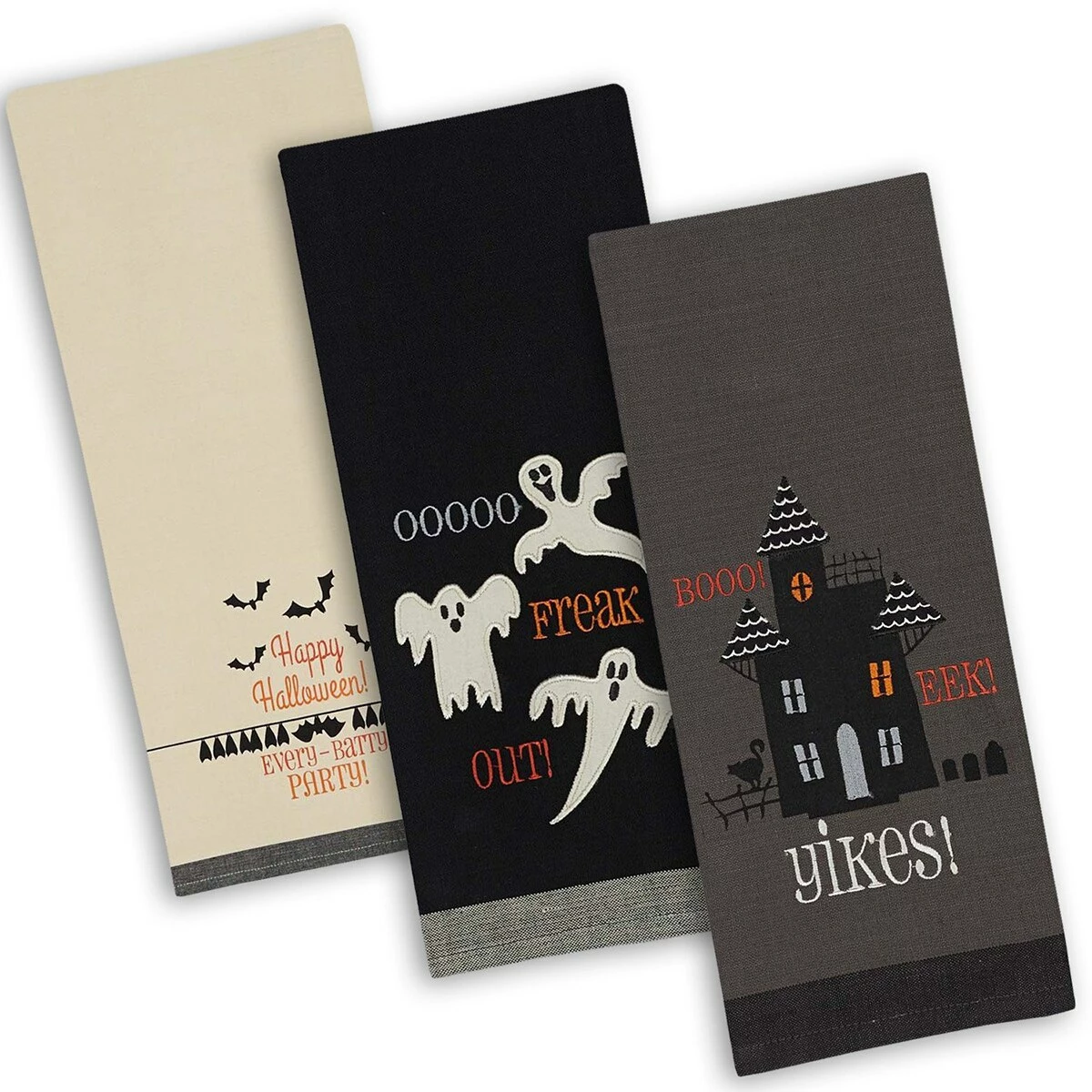 This DII® Halloween set of 3 is a great way to add a little Halloween fun to your kitchen. The set includes two towels each with there own spooky embroidered design and one table runner with embroidery on both ends. The kitchen towels are durable to tackle all drying and cleaning kitchen tasks. They are machine washable for easy cleanup and with each wash, these towels become more absorbent, helping to clean up even the biggest messes.