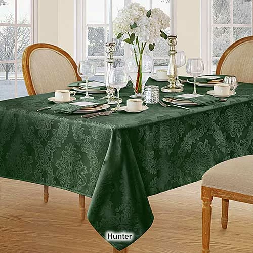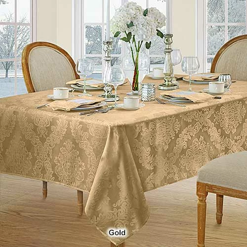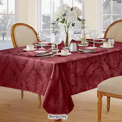 This Elrene Barcelona damask tablecloth will suit any room dรฉcor. It features an allover regal damask design and is stain and water resistant.