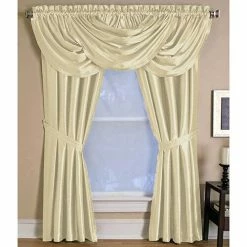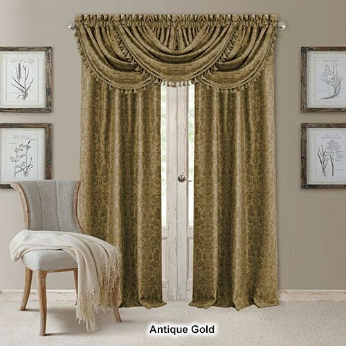 The Elrene Antonia blackout curtain panels showcase a timeless print design. These rod pocket curtains are energy efficient by keeping heat and air conditioning in, keeping light out, and reducing furniture fading. 100% Polyester. Machine wash cold on gentle with like colors. Tumble dry low. One panel per package.Shown: Two 108” panels and 3 waterfall valances.