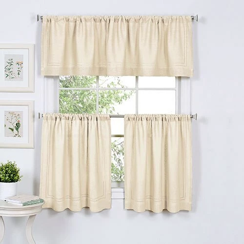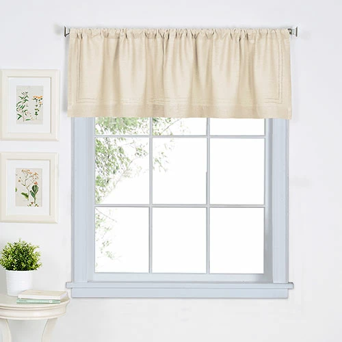 This Cameron valance features a crisp classic look in beautiful updated colors, with hemstitch detail that gives your window an hint of elegance and sophistication. 51% Raylon. 49% Linen. Machine wash cold in gentle cycle with like colors. Use non-chlorine bleach when needed. Tumble dry low. Touch up with iron as needed.