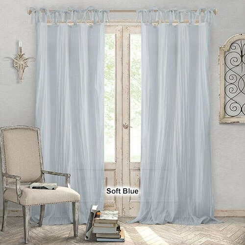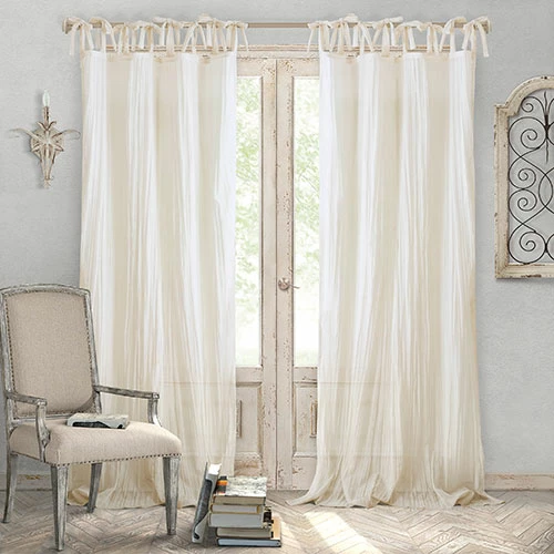 The Elrene Jolie curtain panels are elegant, crushed sheer curtains with adjustable long tie top loops. These tie loops allow you to achieve that custom, airy look. These semi-sheer panels let the light shine in while also providing privacy. 100% Polyester. Machine wash cold. Wash separately. Line dry.Shown: Two 108โ panels.One panel per package.
